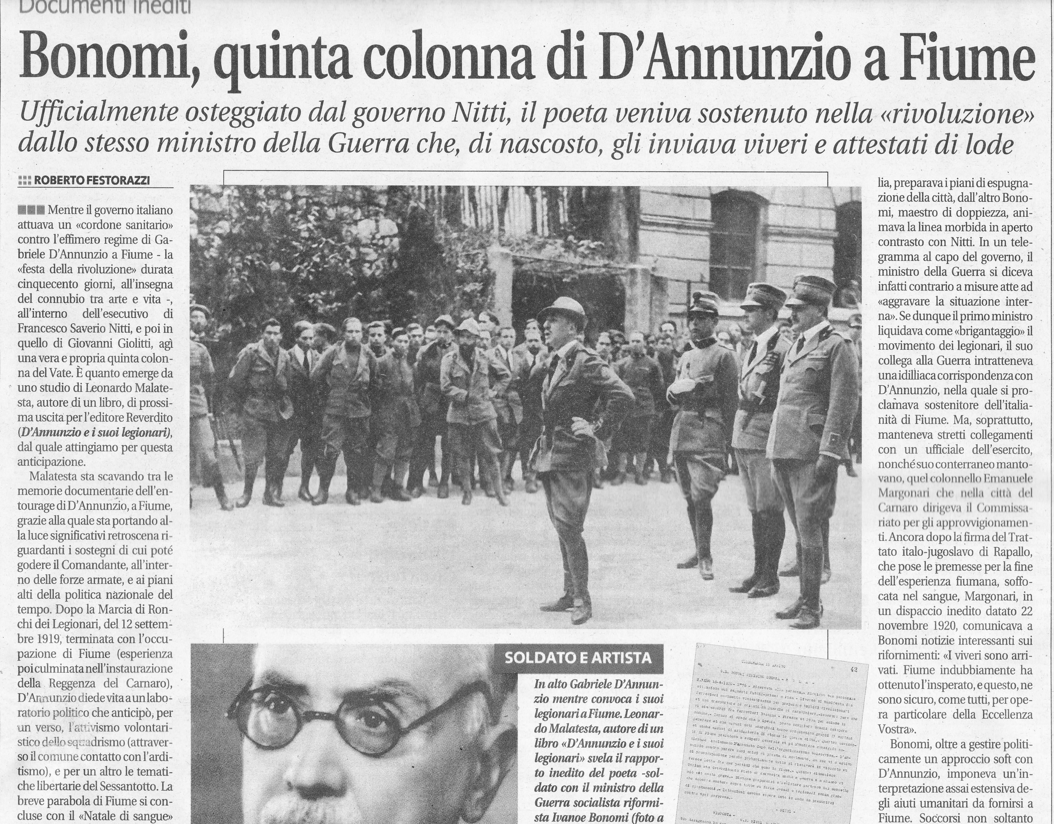 L’articolo ha parlato dei rapporti fra D’Annunzio e Bonomi nell’impresa di Fiume e in generale dei rapporti fra i legionari ed il poeta.