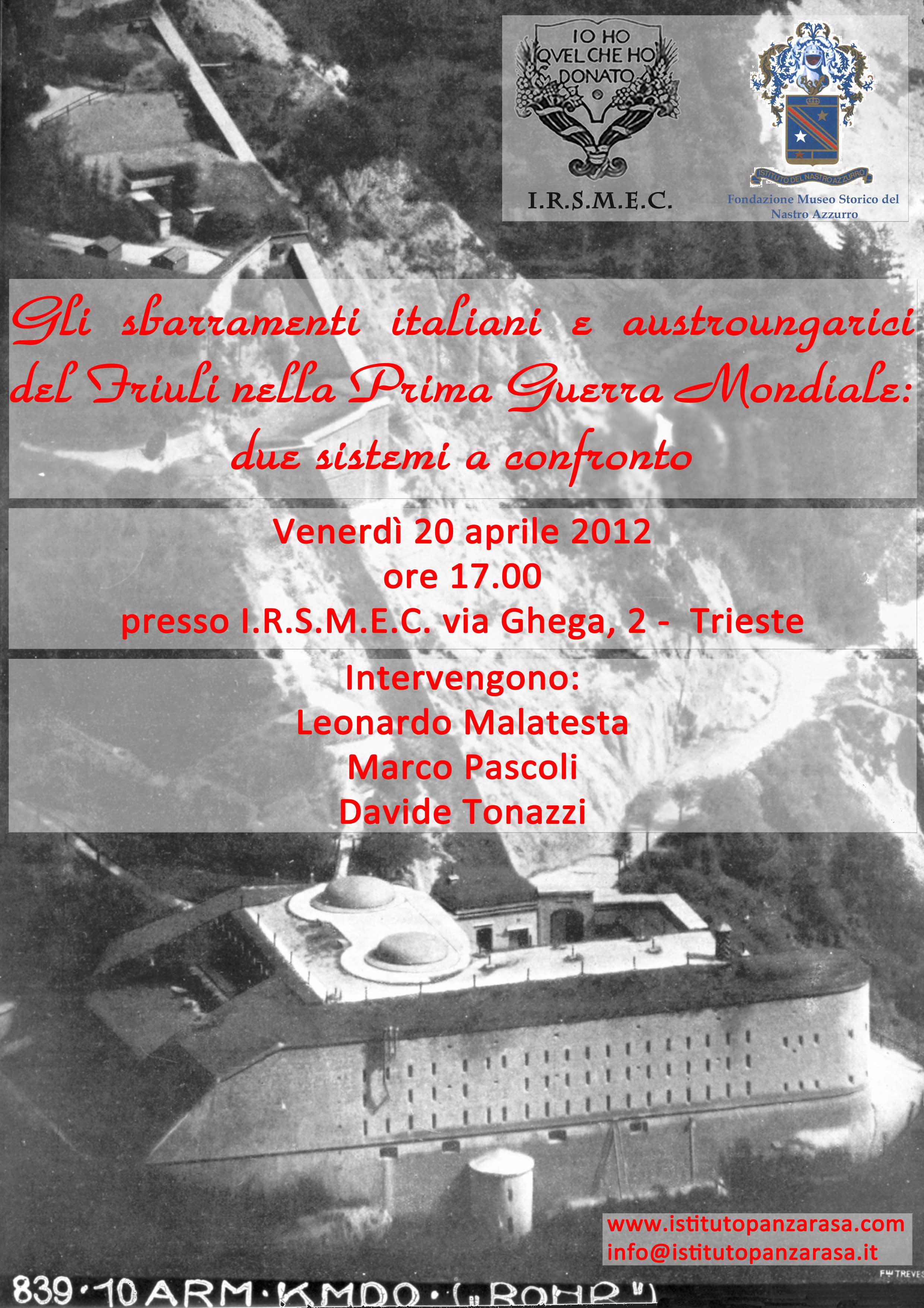 Venerdì 20 aprile 2012, presso l’Istituto di Ricerche Storico Militari dell’Età Contemporanea Carlo Panzarasa, di Trieste, si terrà il convegno Gli sbarramenti italiani e austroungarici in Friuli nella prima guerra mondiale.