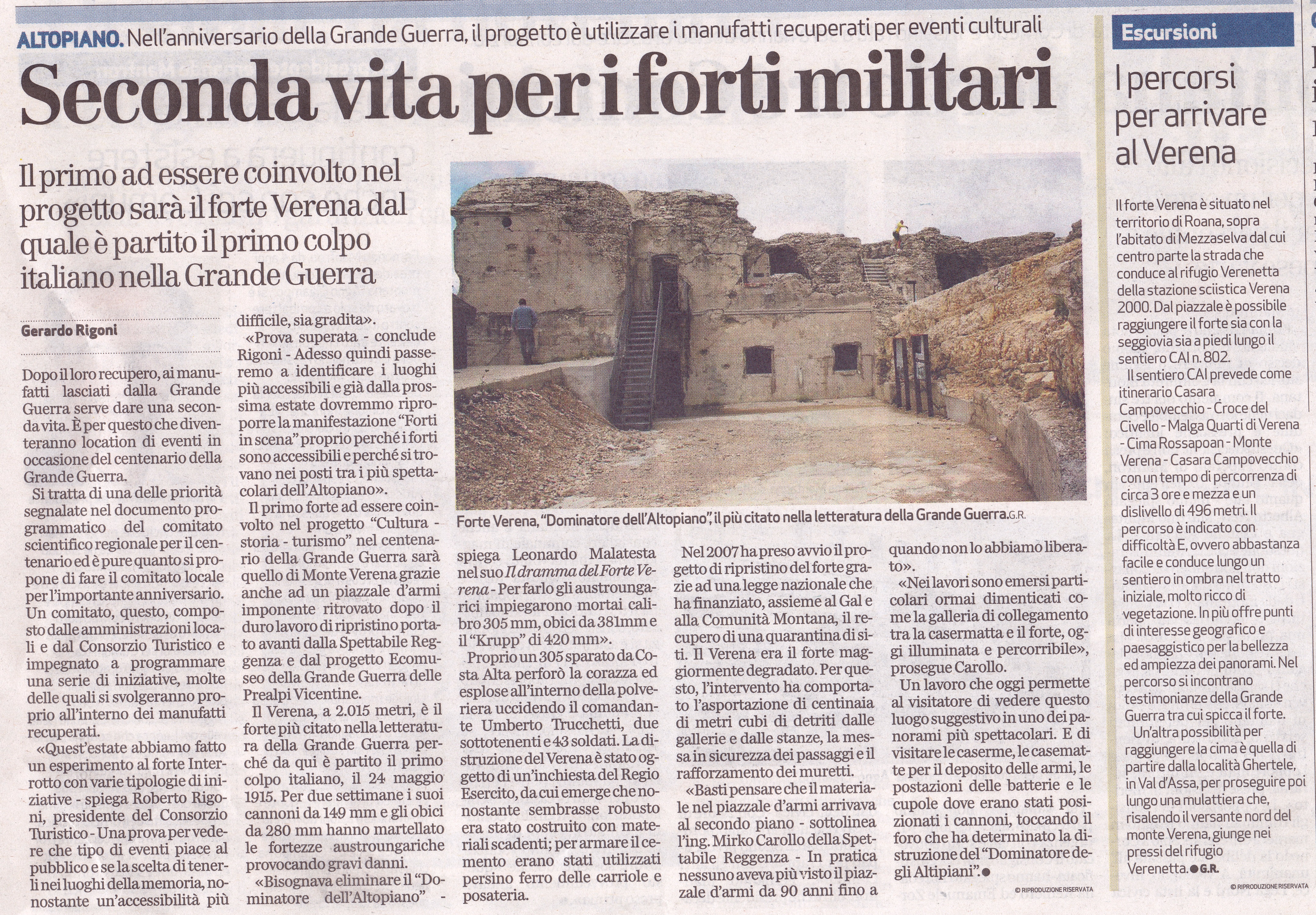 Nel quotidiano Il Giornale di Vicenza si è parlato del ruolo che i manufatti dei forti italiani, come forte Verena o forte Campolongo, avrà nelle prossime manifestazioni del 100° della grande guerra.